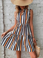 Das Kleid BELLA ist mit einem klassischen Stehkragen ausgestattet. Es ist gestreift, ärmellos, gestuft und geht bis über die Knie. Kombinieren Sie es mit einer Sonnenbrille und Stiefeln für einen schicken Look.